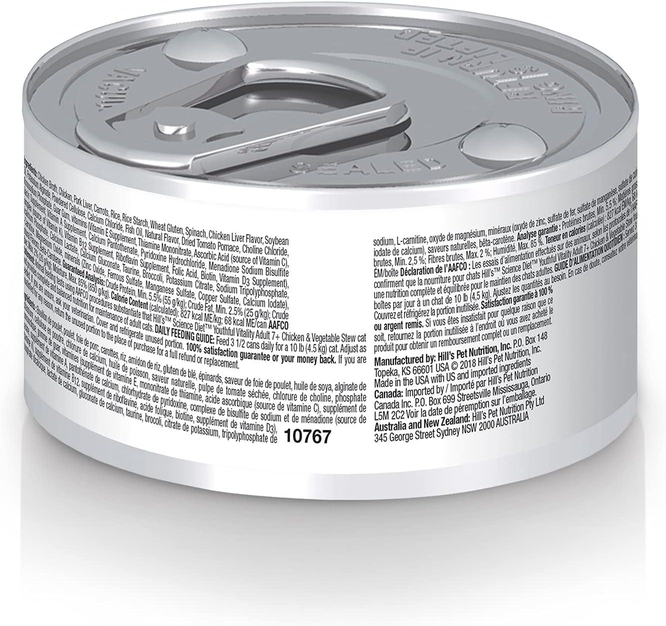 Hill’s Science Diet Senior Vitality Adult 7+, Senior Premium Nutrition, Wet Cat Food, Chicken & Vegetable Stew, 2.9 oz. Cans, 24-Pack